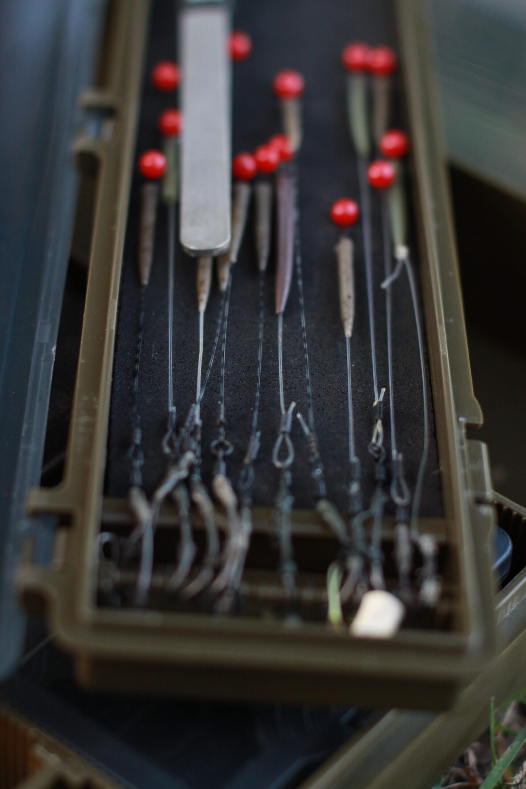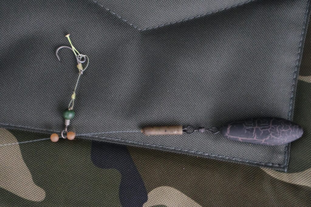 Wenn ich auf Kraut fischen möchte setze ich auf das Chodrig. Dieses binde ich nicht mit Leadcore, sondern ziehe 2 ziemlich enge Perlen auf meine Schlagschnur, fädle dazwischen einen Schnellwechselwirbel auf und befestige am Ende der Schnur das Blei an einem Wirbel. Der Vorteil bei dieser Montage ist die leichte Schlagschnur. Wenn ich die Schnur beim Ablegen der Rute nicht spanne, legt sich die Montage auch auf hohem Kraut ab. Um die Sicherheit des Fisches zu gewährleisten, sollte man darauf achten, dass entweder das Blei ausklingt oder die Perle und der Schnellwechselwirbel über den Schlagschnurknoten rutschen können.