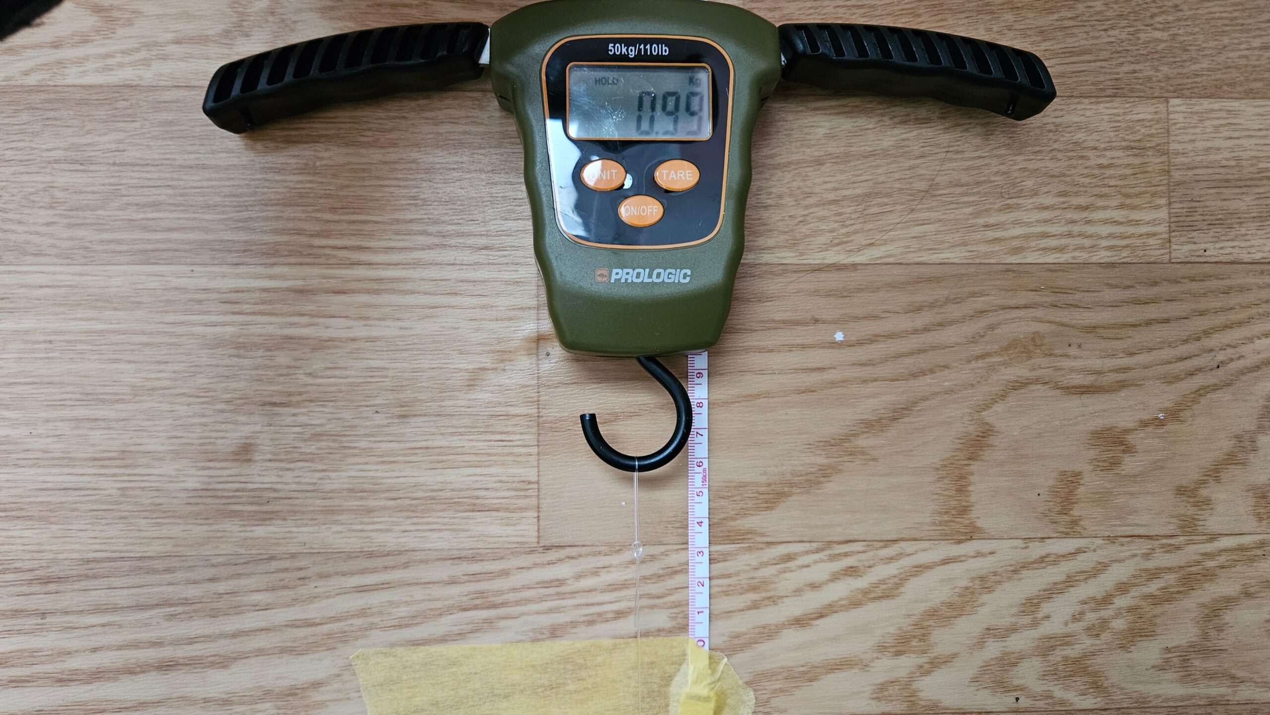 Auch die Dehnung kann entscheidend sein, ob der Fisch aussteigt oder im Kescher landet. Bei einer monofilen Hauptschnur spielt dieser Punkt eher keine Rolle. Geflochtene Schnur dagegen weist keine Dehnung auf und federt somit auch keine Kopfschläge des Fisches ab. Wenn man dann noch eine steife Rute verwendet, um auf weite Distanzen werfen zu können, sollte man darauf achten, dass Kopfschläge ausreichend abgefedert werden. Dies kann man mit einer monofilen Schlagschnur erreichen. Um zu verdeutlichen wie viel Dehnung eine monofile Schlagschnur bei einer bestimmten Zugkraft aufweist, habe ich ein kleines Experiment durchgeführt und folgende Ergebnisse kamen dabei heraus: